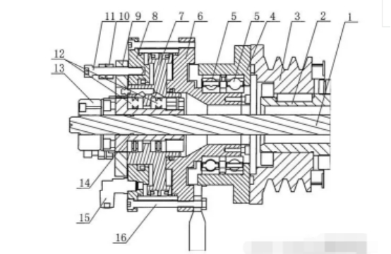 機床工作時皮帶輪帶動主軸高速旋轉,同時夾頭帶動拉桿也跟隨主軸轉動,通常采用兩種方案在機床上設置尾部氣缸 :一種是氣缸跟轉,此時氣缸的進氣設計比較復雜,而且極易漏氣 ;另一種是氣缸與床身固定,這種結構會導致主軸軸承受力,導致主軸軸承的使用壽命縮短,設備可靠性降低。